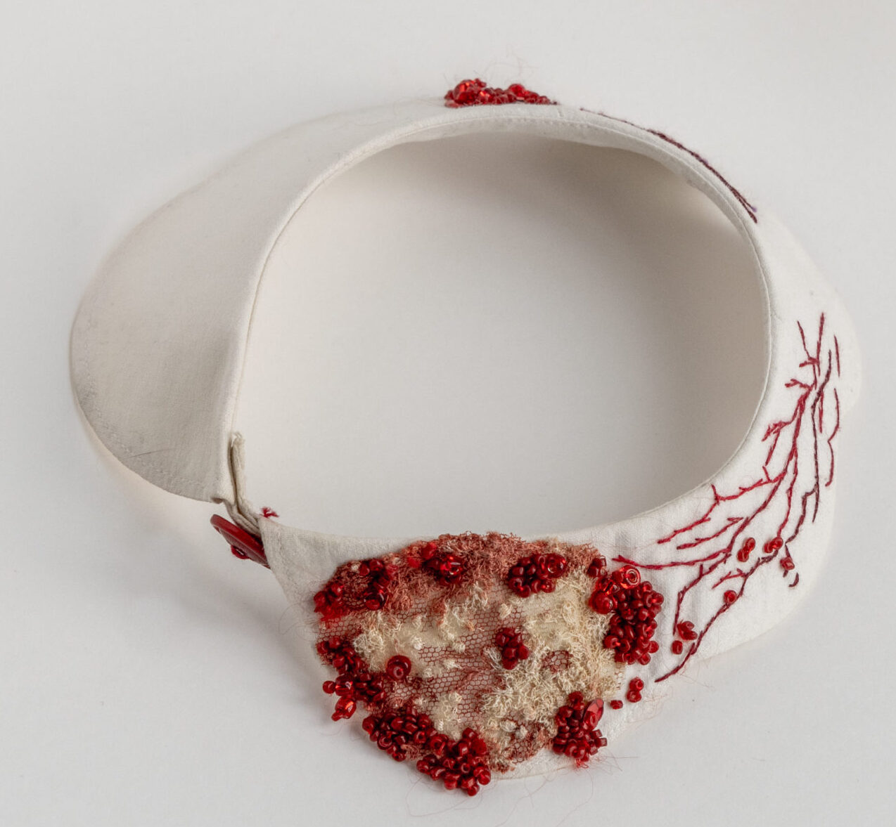 Using traditionally feminine techniques such as sewing and embroidery, her delicate works evoke