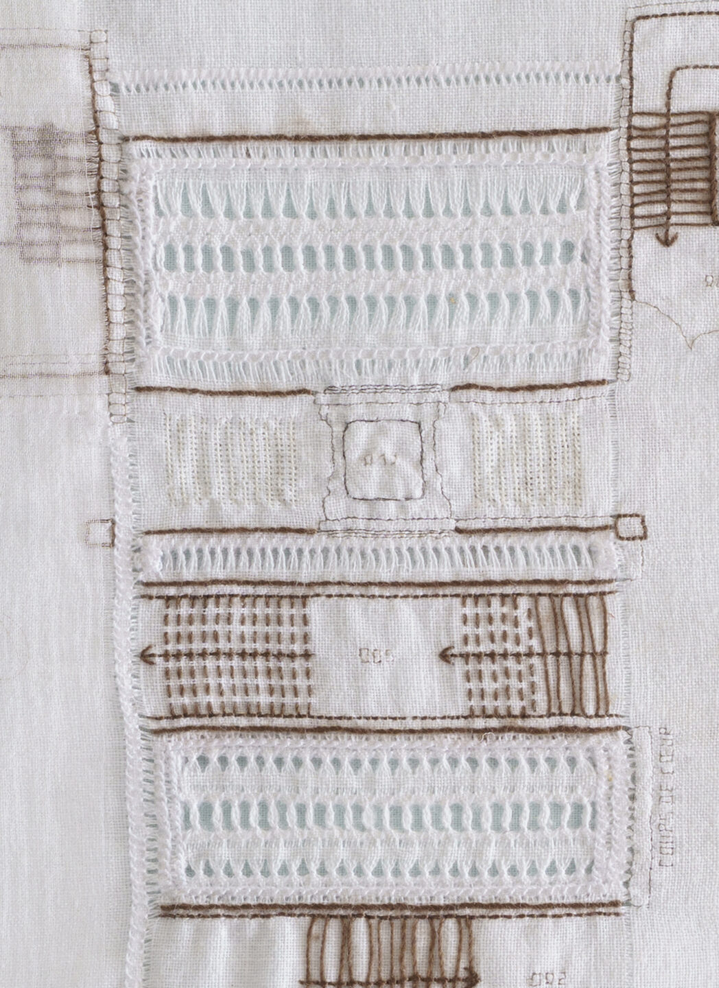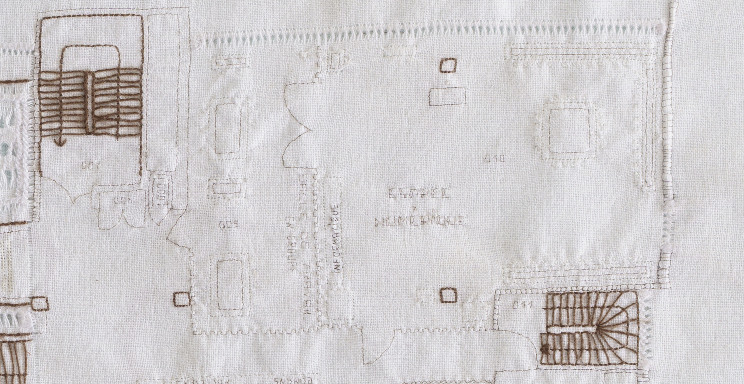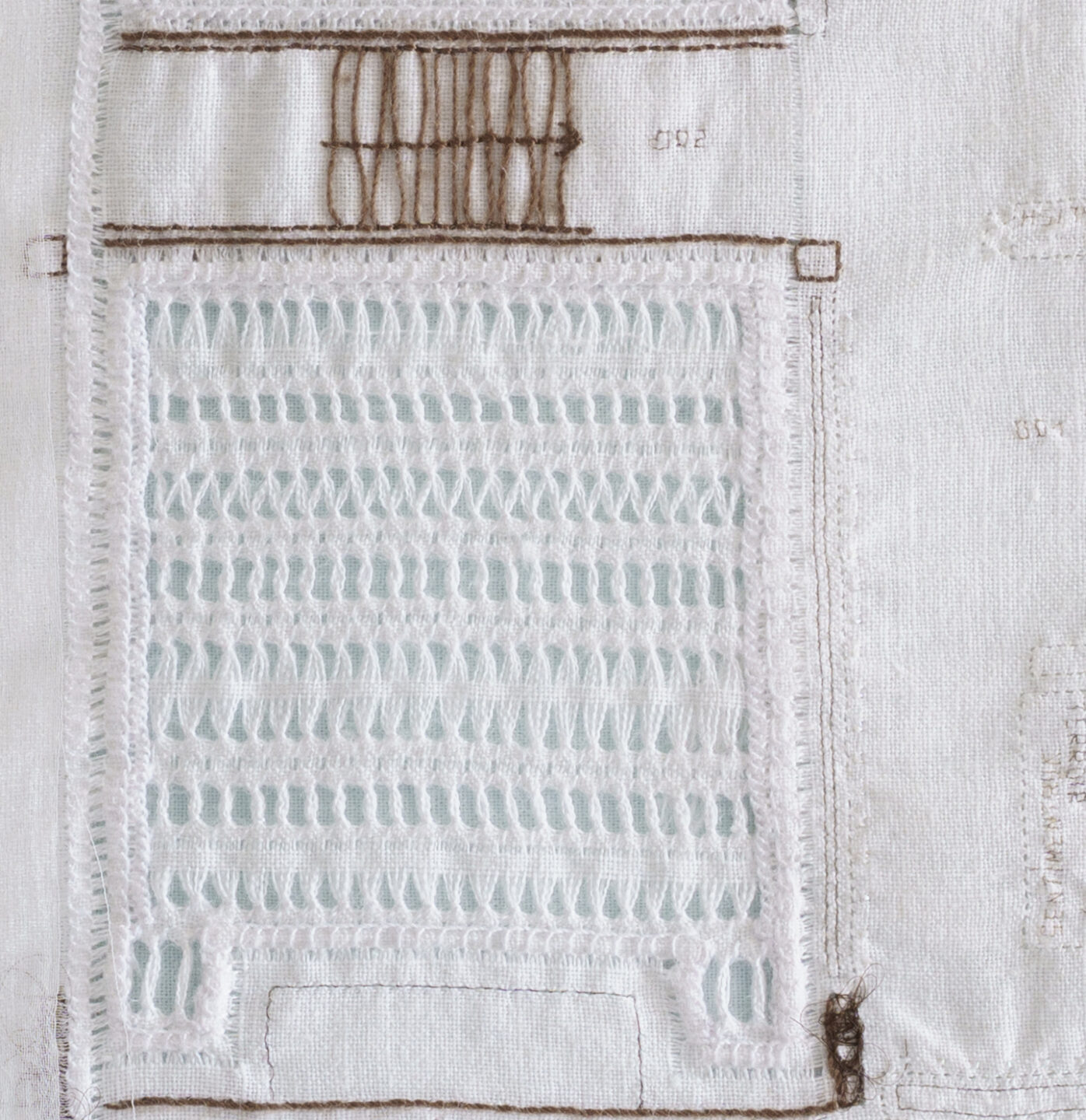 Embroidery and drawn thread work with hair, yak hair, white and brown thread and bright white thread.
