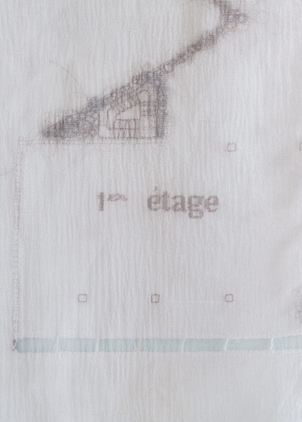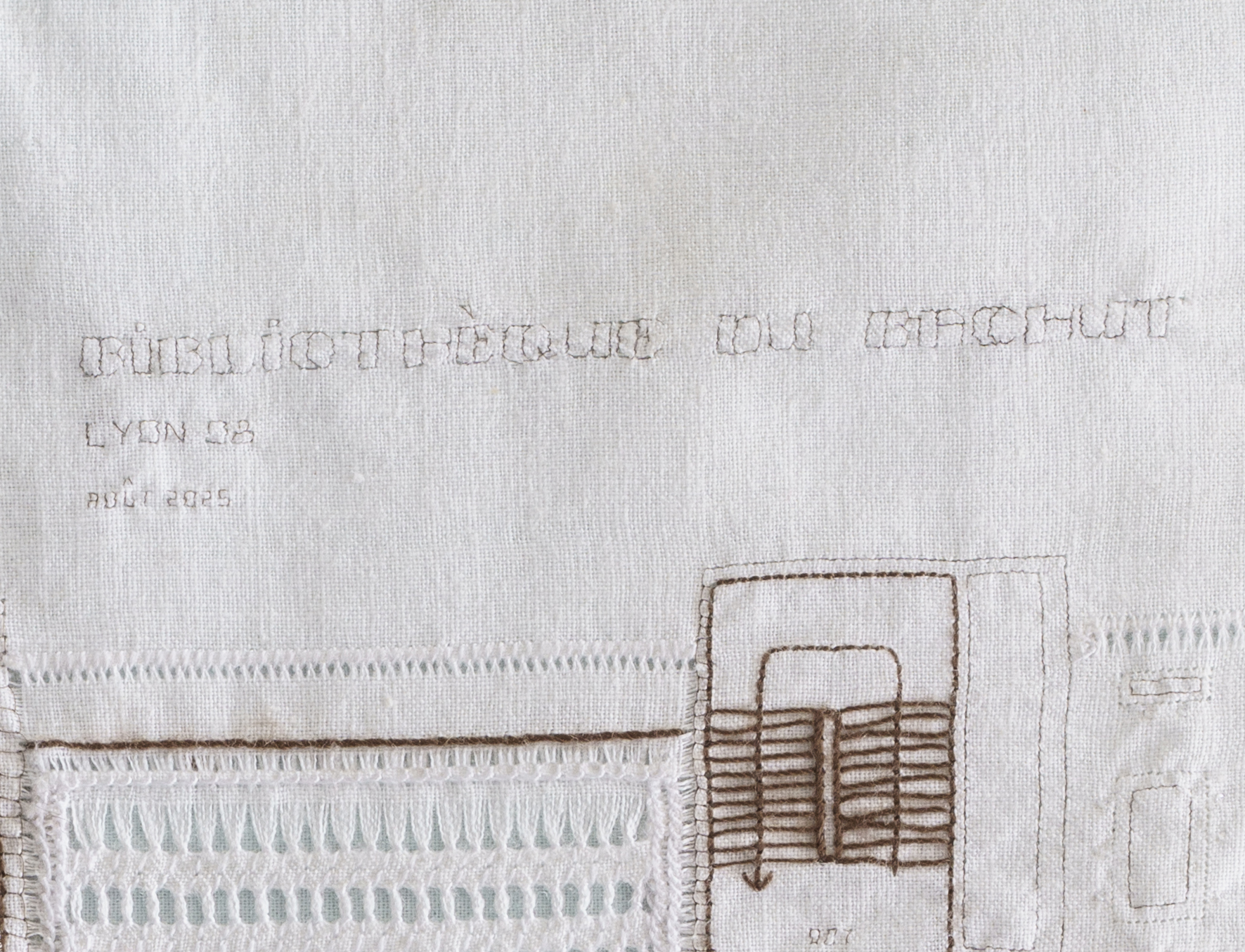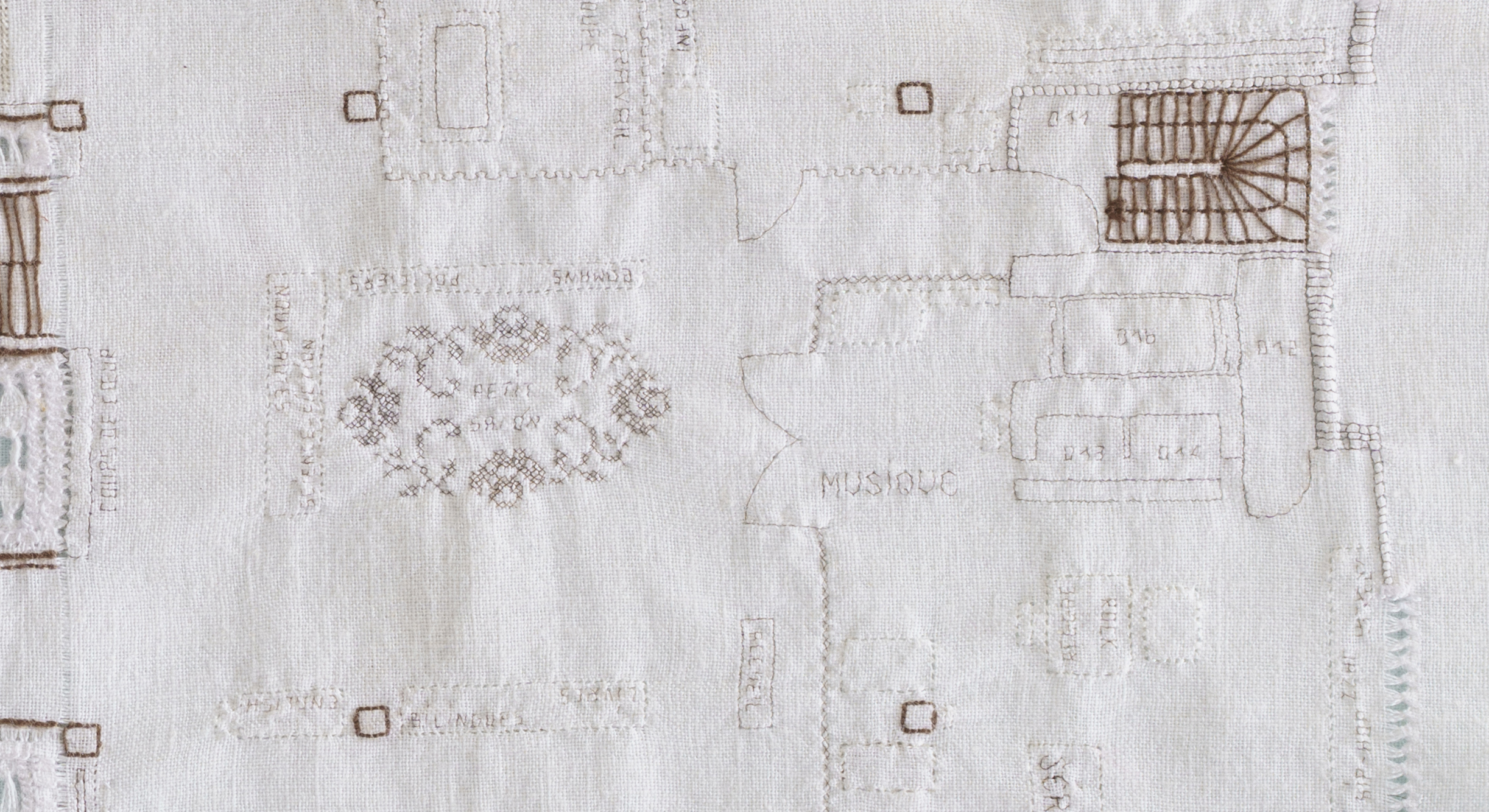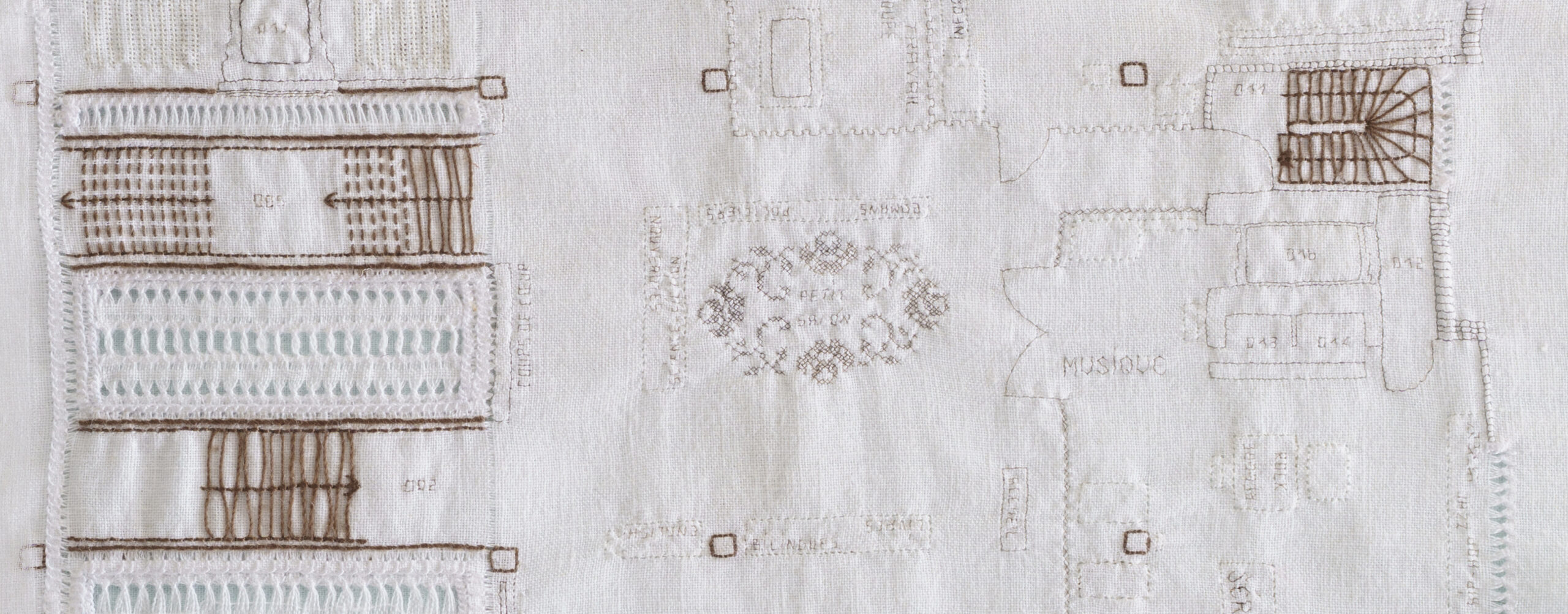 Embroidery and drawn thread work with hair, yak hair, white and brown thread and bright white thread.