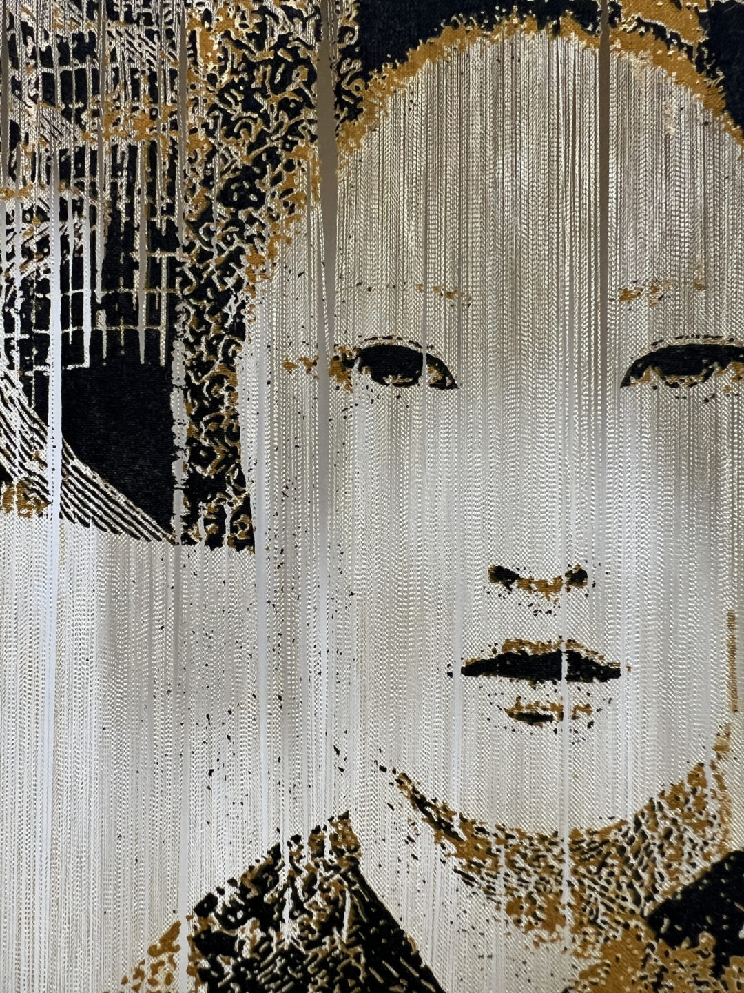 Les fils de soie délicats contrastent avec les éléments graphiques du motif.
