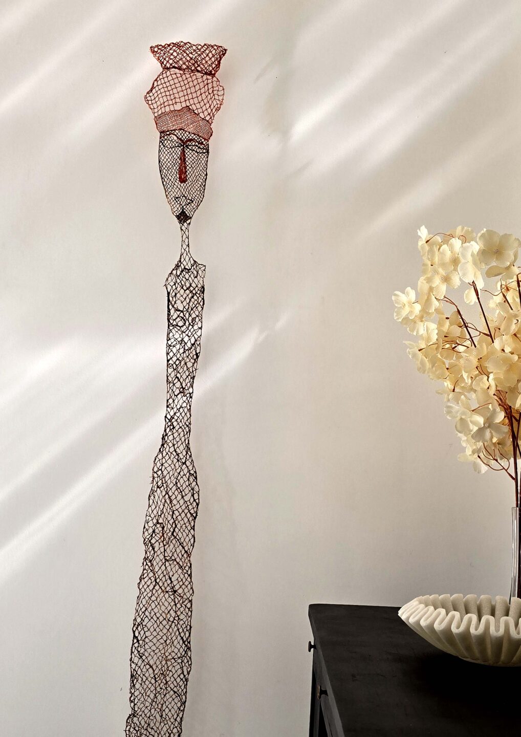 Ma recherche s’articule autour de la verticalité et du dépouillement propre à l’art brut. Si ces sculptures de fil semblent capturer la légèreté d’un souffle ou le passage d’une ombre, elles s’élèvent avant tout avec la stature imposante de Sentinelles.