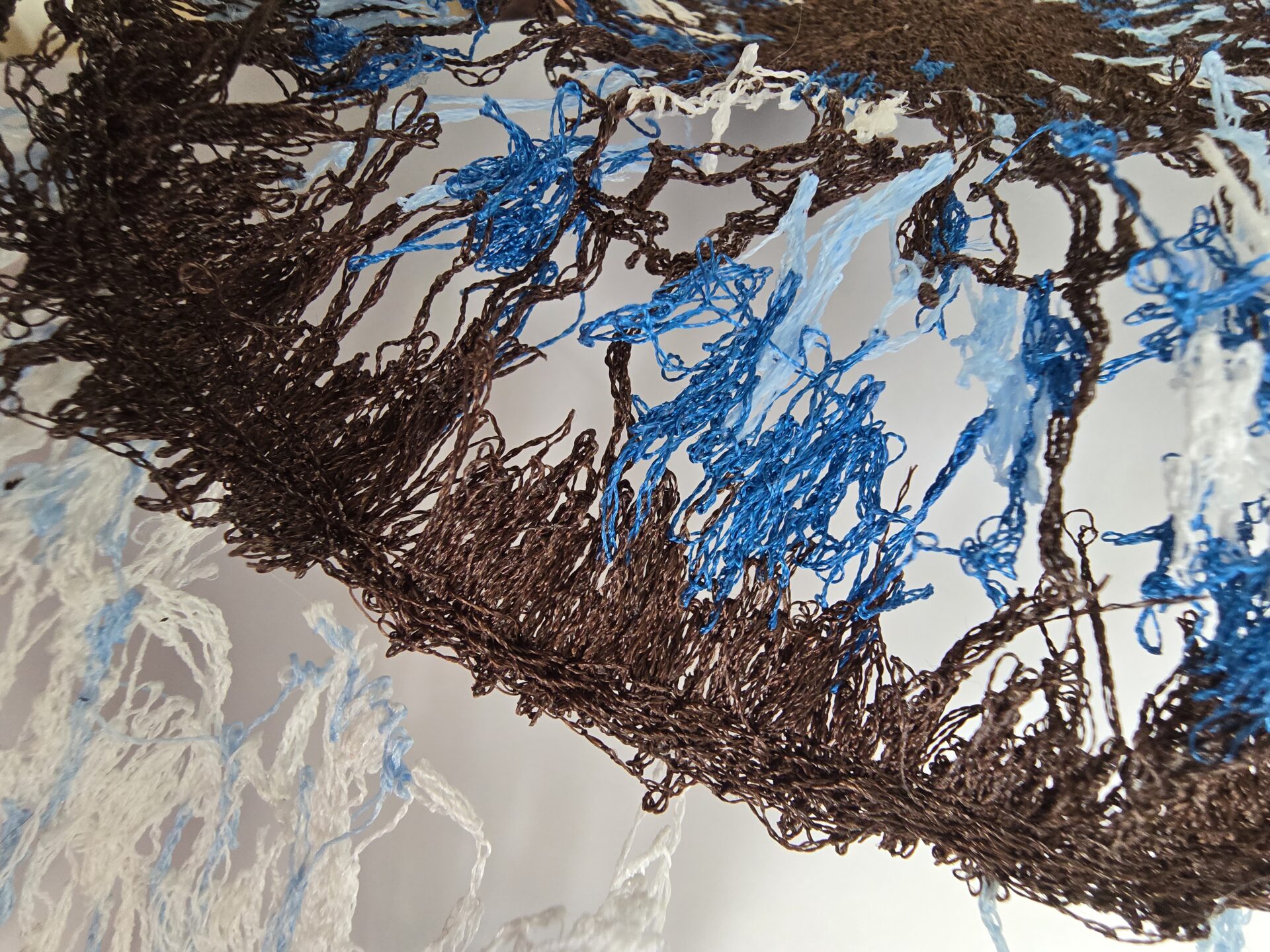 L’œil n’est pas ici un simple organe, mais une porte ouverte sur l’indicible, un véritable talisman tissé pour veiller sur l’espace. La technique crée un maillage qui, malgré sa transparence, offre une résistance étonnante. Telles des amulettes contemporaines, ici le regard est fragile, ce qu’il perçoit est ancré.