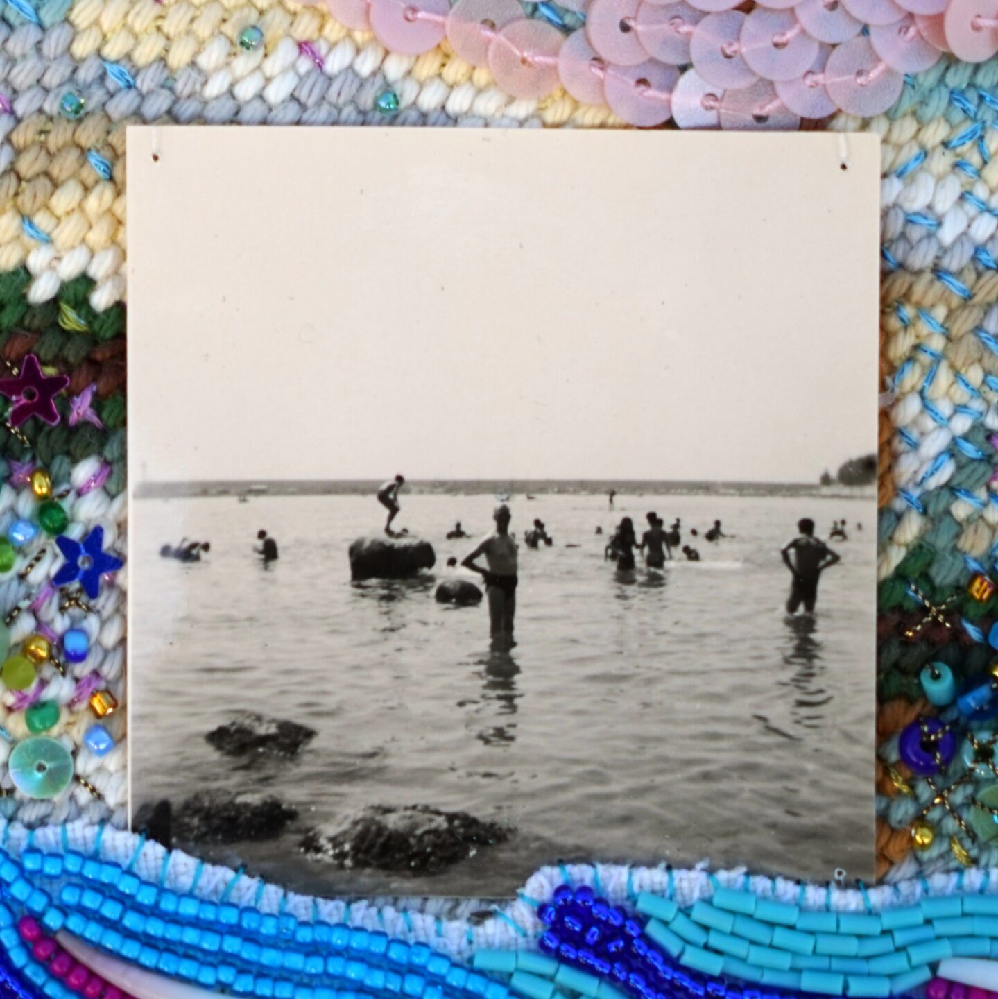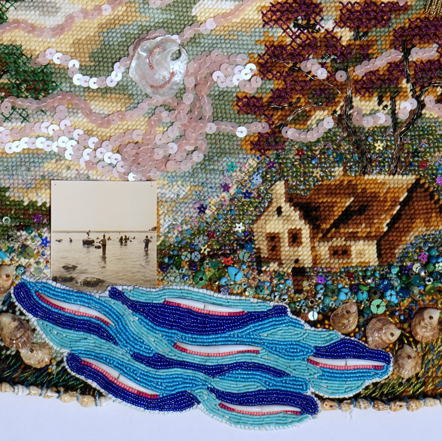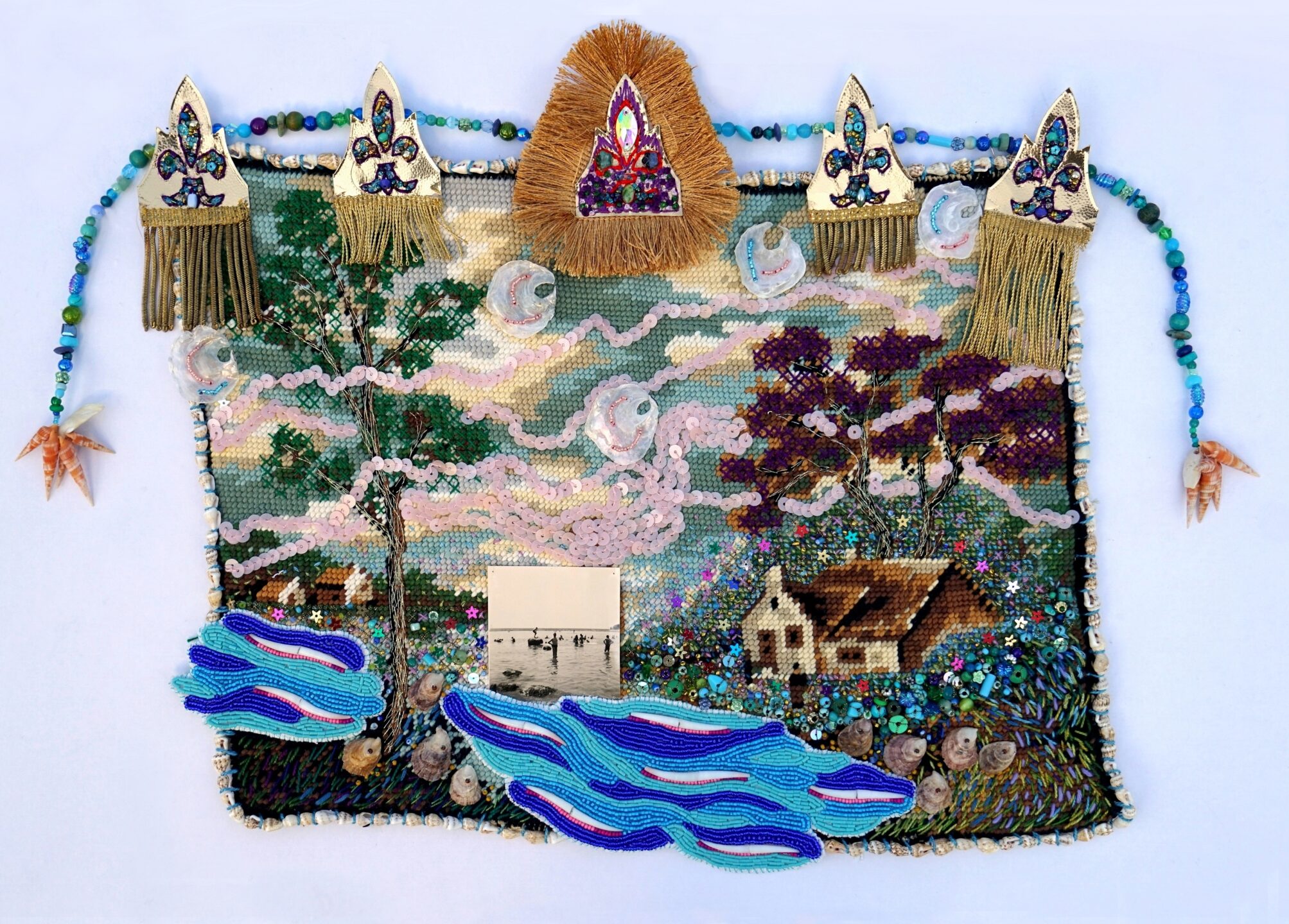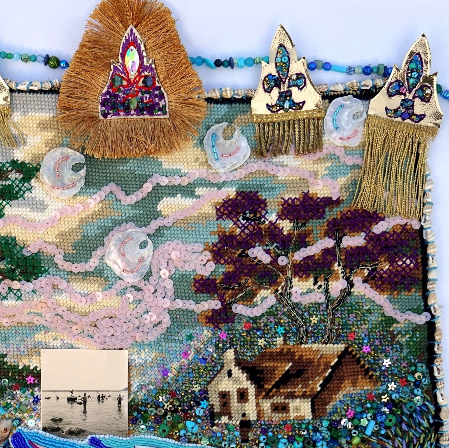 pièce brodée à quatre mains, composition photographie ancienne / coquillages / perles / sequins / fils / rubans / couronne des rois, sur canevas, env. 35X39cm, 2025.